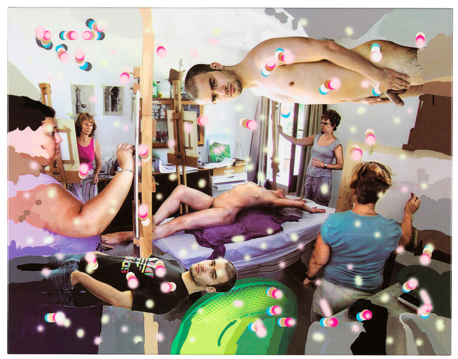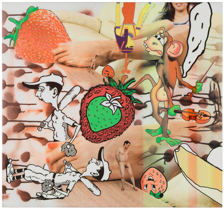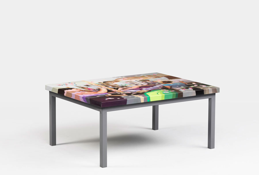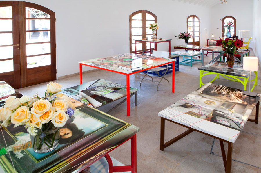 The exhibition title, a collision of furniture and body parts, gives le corps exquis another turn of the screw. The works to which the title alludes are tables that combine large resin-coated photomontages with multicolored steel geometric bases. The jokey surrealist montages juxtapose images both found and manipulated—a pair of sausages, a cartoon snail, a graffiti-covered wall, an open mouth, a Hong Kong supermarket. Blurring the distinctions between photography, collage, sculpture, and furniture, the tables are objects both aesthetic and useful, filling the gallery with a presence that is at once visually arresting and socially convivial.
